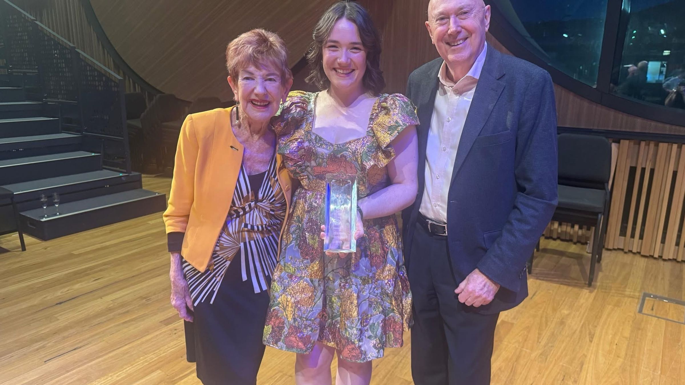 Pictured: Sarah Wood with Ron and Margaret Dobell, generous sponsors of the Dobell Award.